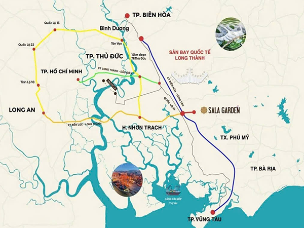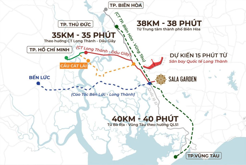 Tọa lạc tại Long Thành, Đồng Nai, chỉ cách Sài Gòn 35 phút di chuyển. Sala Garden có vị trí phong thủy độc tôn, được ôm trọn bởi vành đai tâm linh với rất nhiều ngôi chùa, thiền viện và giáo xứ lớn, có lịch sử hàng trăm năm như: Thường Chiếu, Linh Chiếu, Hiền Hòa,… tạo nên một không gian thanh tịnh, an yên.